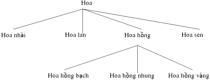 Ta có thể thấy, nghĩa của từ “hoa hồng” khái quát hơn nghĩa của từ “hoa hồng nhung”, vì nó bao trùm lên các từ: hoa hồng nhung, hoa hồng vàng, hoa hồng bạch, … Nghĩa của từ “hoa” lại khái quát hơn nghĩa của từ “hoa hồng”. Đó chính là cấp độ khái quát của nghĩa từ nghĩa.